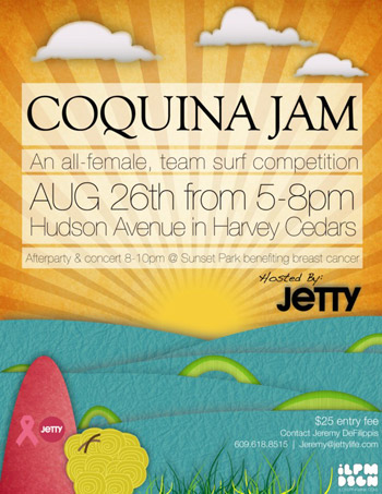 With the success of The Jetty Clam Jam last fall comes the 1st annual Coquina Jam, an all-female, team-oriented surf contest to be held at Hudson Avenue in Harvey Cedars, NJ on August 26th. As more and more ladies pleaded to compete in The Clam Jam, Jetty figured it best to dedicate an entire day (and contest) to them! The 32 local surfers will be randomly paired together in teams of 2 and the final 4 teams will advance to the women’s final which will be held @ The 3rd Annual Jetty Clam Jam on October 10th.