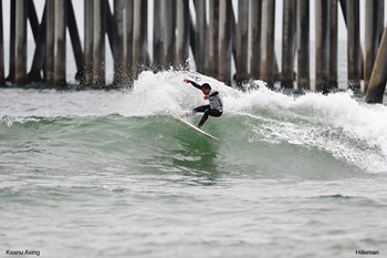 Asing battled through the tough conditions on offer at South Huntington Beach Pier this afternoon, blasting strong outside turns on the set-waves and managed to work his way through the infamous reform, finishing each wave with strong maneuvers.