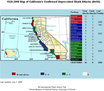 The publication “Shark Attacks of the Twentieth Century” authenticated 108 unprovoked shark attacks from the Pacific Coast between 1900 and 1999. The Great White Shark was implicated in 94 (87%) of the attacks with an annual average of slightly more than one shark attack per year. The 7 cases reported for 2009 brings the total number of unprovoked shark attacks occurring along the West Coast during the first 9 years of the 21st Century to 49.