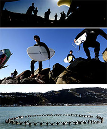 More than 100 people watched from the shore as surfers paddled into the formation.