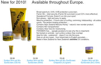 Seabase International announces they are to distribute the Surfer’s Skin range of sunscreens in Europe Developed in New Zealand to overcome the severe UV conditions experienced by surfers, the Surfers Skin range of waterproof sunscreens has been widely accepted throughout New Zealand in all outdoor pursuits where it’s waterproof, sweat-proof and non-sting qualities have been praised. The development company, Skin Alive, also produces a range of sunscreen for Golfers and Snowboarders and skiers with all products accepted for a huge range of other activities and its qualities become well known. Claiming a 30+ SPF factor, (Factor 50 is only 0.5% more effective) and at least two hours of waterproof protection and Broad Spectrum UVA/UVB protection, Surfers Skin is perfect for any conditions likely to be experienced anywhere in Europe. “We consistently get UV ratings of 15 out of 15 – extreme conditions with very short burn times in our New Zealand summers. Surfers Skin, with its high protection factor, ease of application, and safety factors will be the choice of all surfers – just as it has been in New Zealand for years” says Seabase International Director Murray Steward. “We are proud to offer it under our 100% Quality 100% Waterproof sign-off in Europe – it perfectly fits our quality image as we strive to offer total and complete satisfaction in both product and service to the surf industry”. Surfers Skin has paid close attention to safety issues with the product line containing no Parabens or nanoparticles. Rich in nature’s new wonder material, Manuka Honey, and aloe vera, Surfers skin is particularly safe to use for children and its sweat-proof formula doesn’t run easily to sting young eyes. Safe for all skin types.